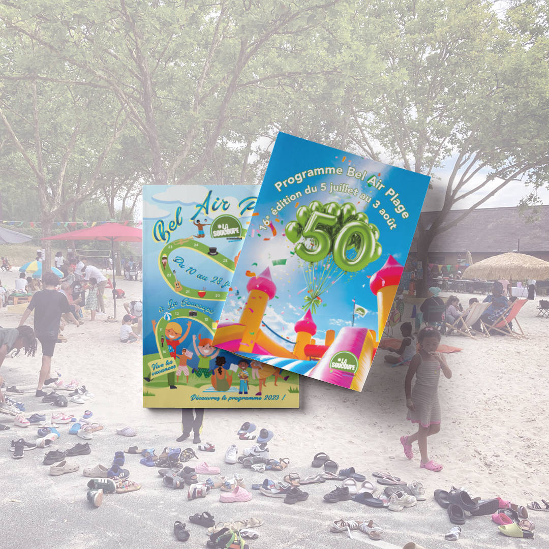 Depuis 2015, création des plaquettes du programme annuel, de la communication de Bel Air Plage. En 2016, de l’événement des 40 ans de La Soucoupe. En 2018 les 10 ans de Bel Air Plage.